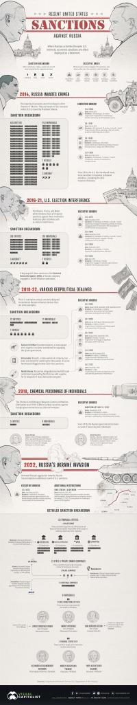 يبدأ الانفوجراف بالعقوبات الاقتصادية التي طبقت في عام 2014 عندما شنت روسيا الحرب على أوكرانيا أثناء ادارة الرئيس أوباما