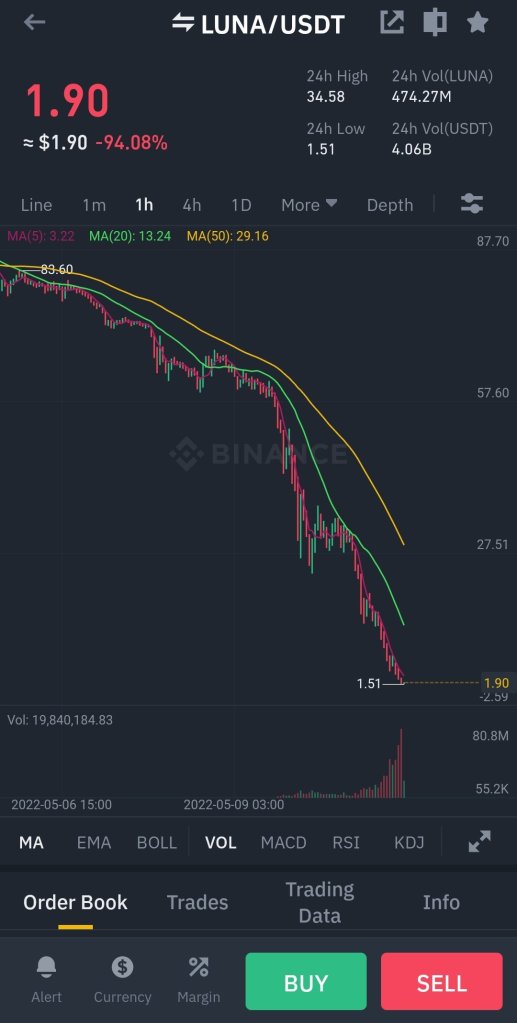 و قد سجلت احد العملات الرقمية الحديثة – لونا كوين – خسارة اليوم بلغت 95% و ذلك في يوم واحد فقط و كانت اخبار خسائر حاملوها مؤلمة جدا عبر وسائل التواصل الاجتماعي خصوصا بين الاخوة العرب، حيث سجل احدهم خسارة بلغت مليون و سبعمائة الف دولار و ذلك بنهاية اليوم