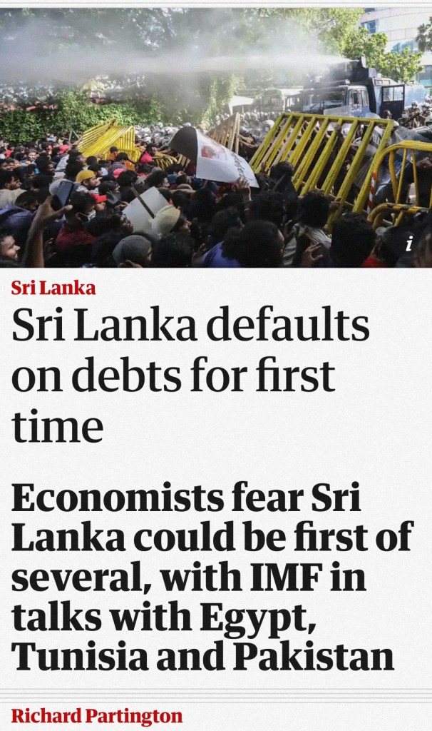 اما في الاسواق العالمية فقد اعلنت سريلانكا عدم قدرتها على الوفاء بسداد اقساط الدين المطلوبة منها هذا الاسبوع و بالتالي تم اعلان افلاس البلاد وسط حالة غير مسبوقة من التوترات في البلاد و ارتفاع متتالي يومي في اسعار السلع و الخدمات و البترول و قد توقع الاقتصاديون هذا الافلاس و لكنهم يتوقعون للاسف ان يتبع هذا الافلاس العديد من الحالات المشابهة و اولهم تونس و مصر
