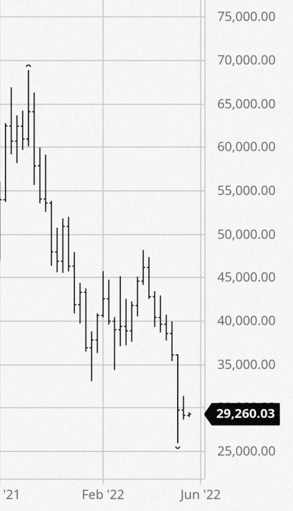 و قد دخل مؤشر اس اند بي رسميا فى حالة السوق الهابط و التى فيها يعتبر اي صعود هو تصحيح عكس الاتجاه العام و ذلك بعكس حالة السوق الصاعد و بذلك يكون قد انضم الى مؤشر الناسداك و الراسل في هذا الاتجاه و هم ينتظرون انضمام مؤشر الداو جونز اليهم في هذا الاتجاه رسيما حيث لم يتعدى قيمة خسارته من القمة السابقة -16% – يجب ان تتعدى 20% حتى نستطيع ان نقول انه في سوق هابط –