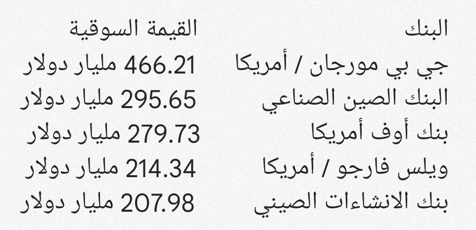 البنك القيمة السوقية جي بي مورجان / أمريكا 466.21 مليار دولار البنك الصين الصناعي 295.65 مليار دولار بنك أوف أمريكا 279.73 مليار دولار ويلس فارجو / أمريكا 214.34 مليار دولار بنك الانشاءات الصيني 207.98 مليار دولار