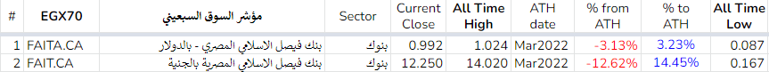 و بالطبع يأتي بنك فيصل المدرج بالجنيه المصري في القائمة و كما هو الحال في ادراجه الدولاري فإن قمته السنوية نفس قمته التاريخية مما يعزز من قوة هذا المستوى السعري