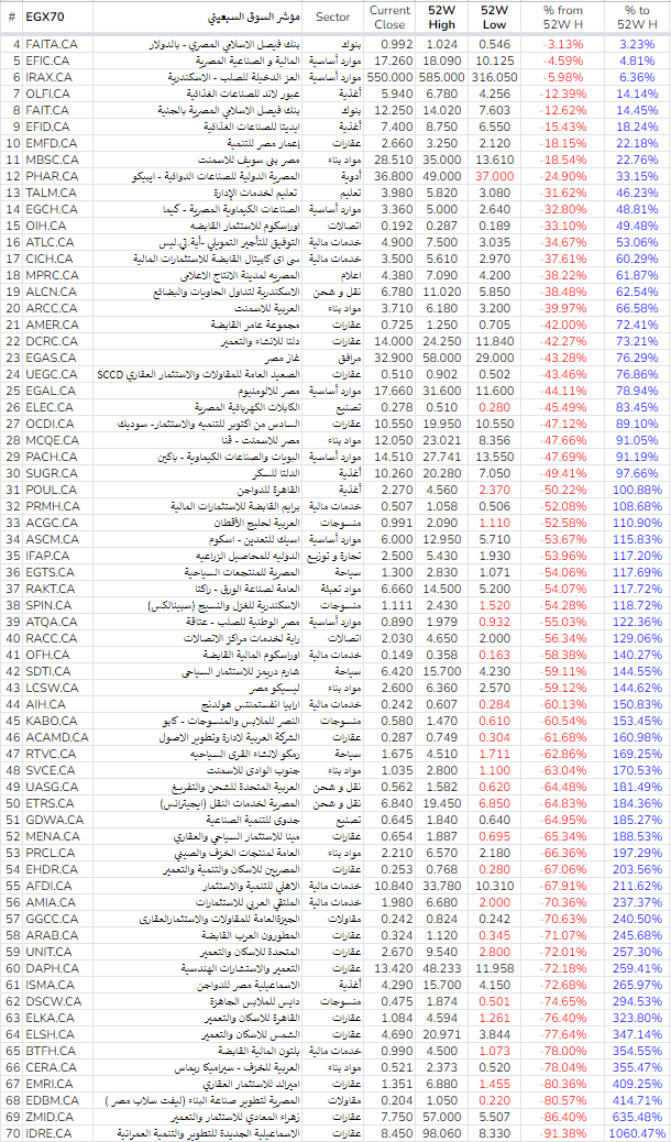 من أصل 71 شركة: هناك فقط 6 شركات قريبة من أعلى سعر خلال 52 أسبوع و تتراوح نسبة المسافة بينهم حول 15% من القمة