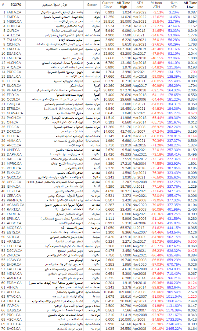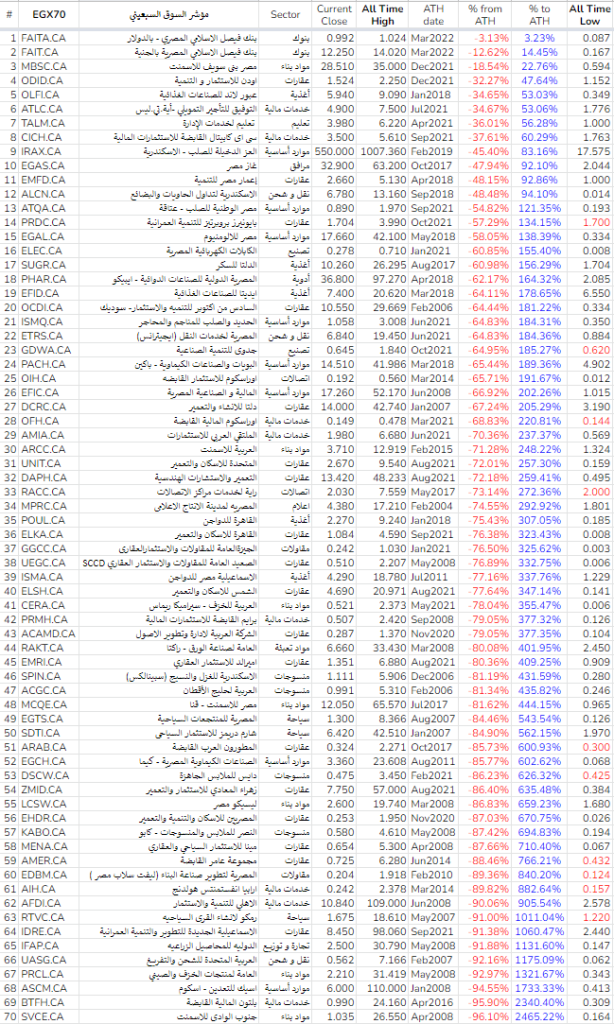 هذه بعض الملاحظات التي نراها للاسهم حول الحدود السعرية لفترة 52 أسبوع سابقة لاهمية هذه الحدود و نرفق أيضا حالة الأسهم حول حدودها السعرية التاريخية منذ الادراج و توقيت تحقيق أعلى و أقل سعر في تاريخ الأسهم و حالة السعر الحالى من أعلى قمة تمت في تاريخ تلك الأسهم فهى توضح الكثير من الأمور خاصة اذا قرنت بالقائمة السابقة