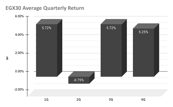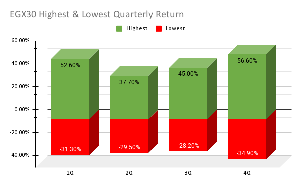 و ننظر هنا الى متوسط عائد المؤشرات و ايضا الى افضل و اسوء آداء للمؤشرات في خلال فترات الربع السنوي في تاريخ السوق مما يوضح لنا الكثير من الأمور