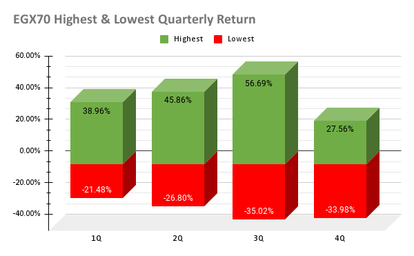 و لنعلم حدود حركة المؤشرات خلال فترات ربع السنة ننظر الى هذا المخطط الذي يوضح أعلى و أقل عائد حدث لكلا مؤشر على حده في فترات ربع سنوية خلال تاريخهم