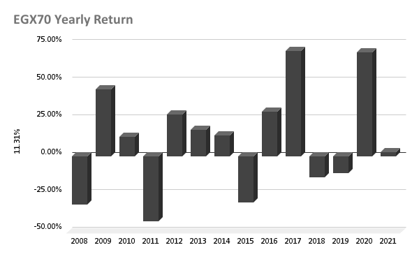 جدير بالملاحظة أيضا ان المؤشر السبعيني له نموذج في توالي سنوات الصعود و الهبوط فكان يصعد لعامين متوالين ثم يليهم بسنة يخسر فيها الكثير من عائداته و لم يخالف هذا النموذج الا مرة واحده و من الملاحظ أن النوذج ربما يتشكل الآن و يكون العام الحالي 2022 عام تصحيحي أو خسارة في العائد بعدما سجل المؤشر عائد في العاميين السابقين بنسب 69.3 في 2020 و 2.64 في 2021